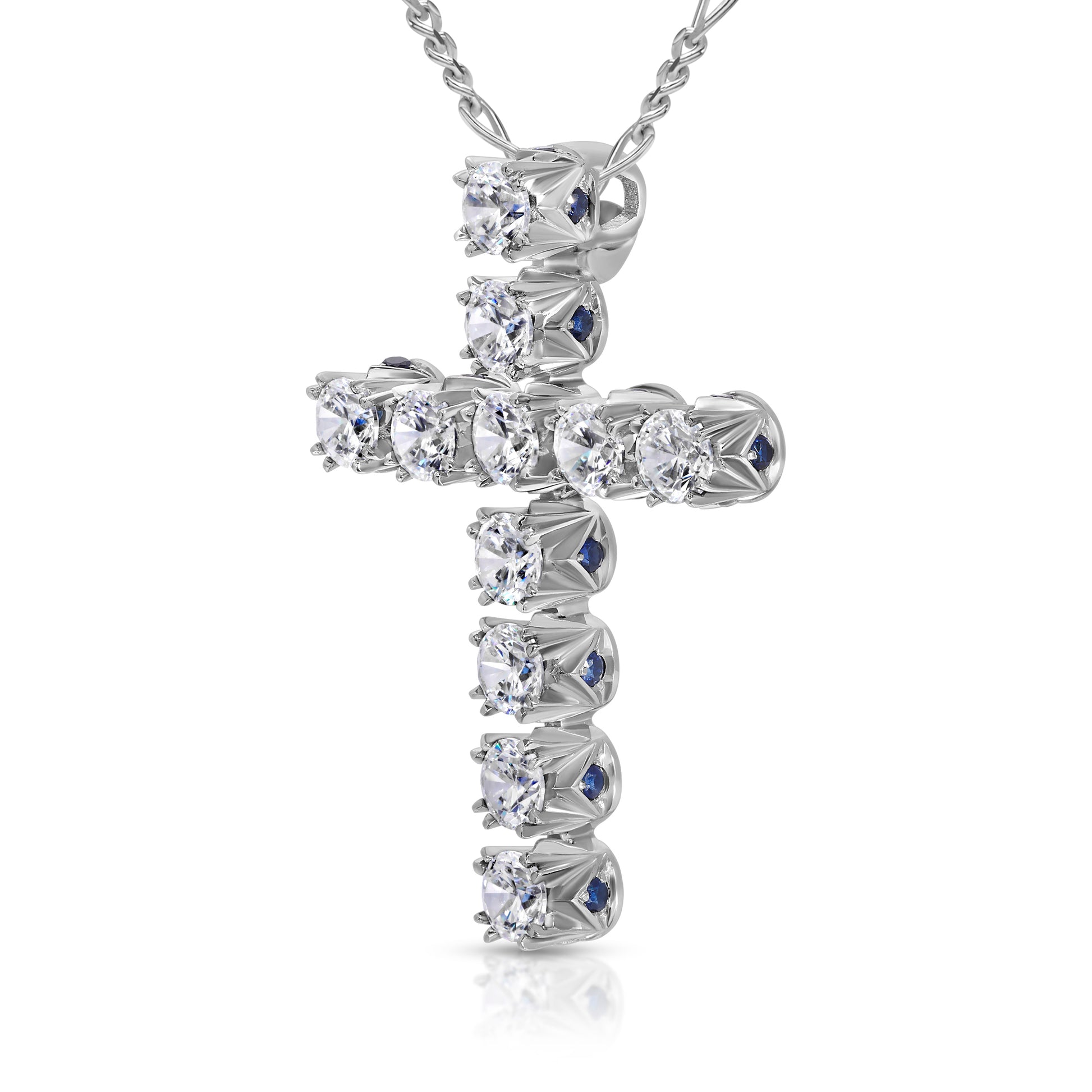 A refined cross pendant that embodies grace and strength. Meticulously crafted in solid 18K white gold, this pendant is set with dazzling lab-grown diamonds in a crown-inspired design, enhanced with deep blue sapphires for a subtle contrast of light and color. Its luminous finish and timeless form make it an exceptional piece for gifting or as a meaningful addition to your own collection.
