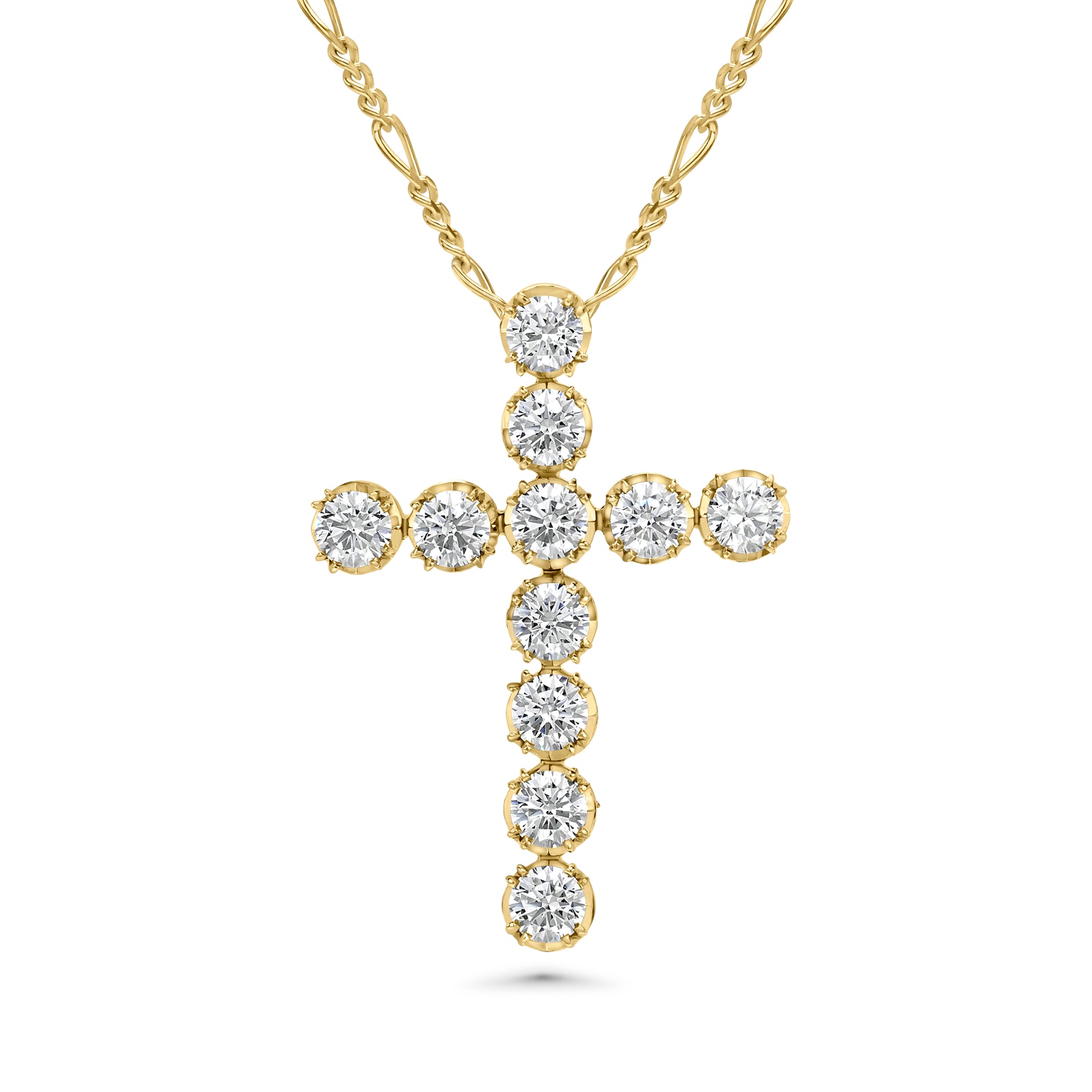 A radiant cross pendant that symbolizes faith and elegance. Expertly crafted in solid 18K gold, this piece is adorned with brilliant lab-grown diamonds in a bold crown-inspired setting, complemented by vibrant sapphires for a touch of color and light. With its refined balance of strength and beauty, this pendant makes a meaningful gift or a timeless addition to any jewelry collection.