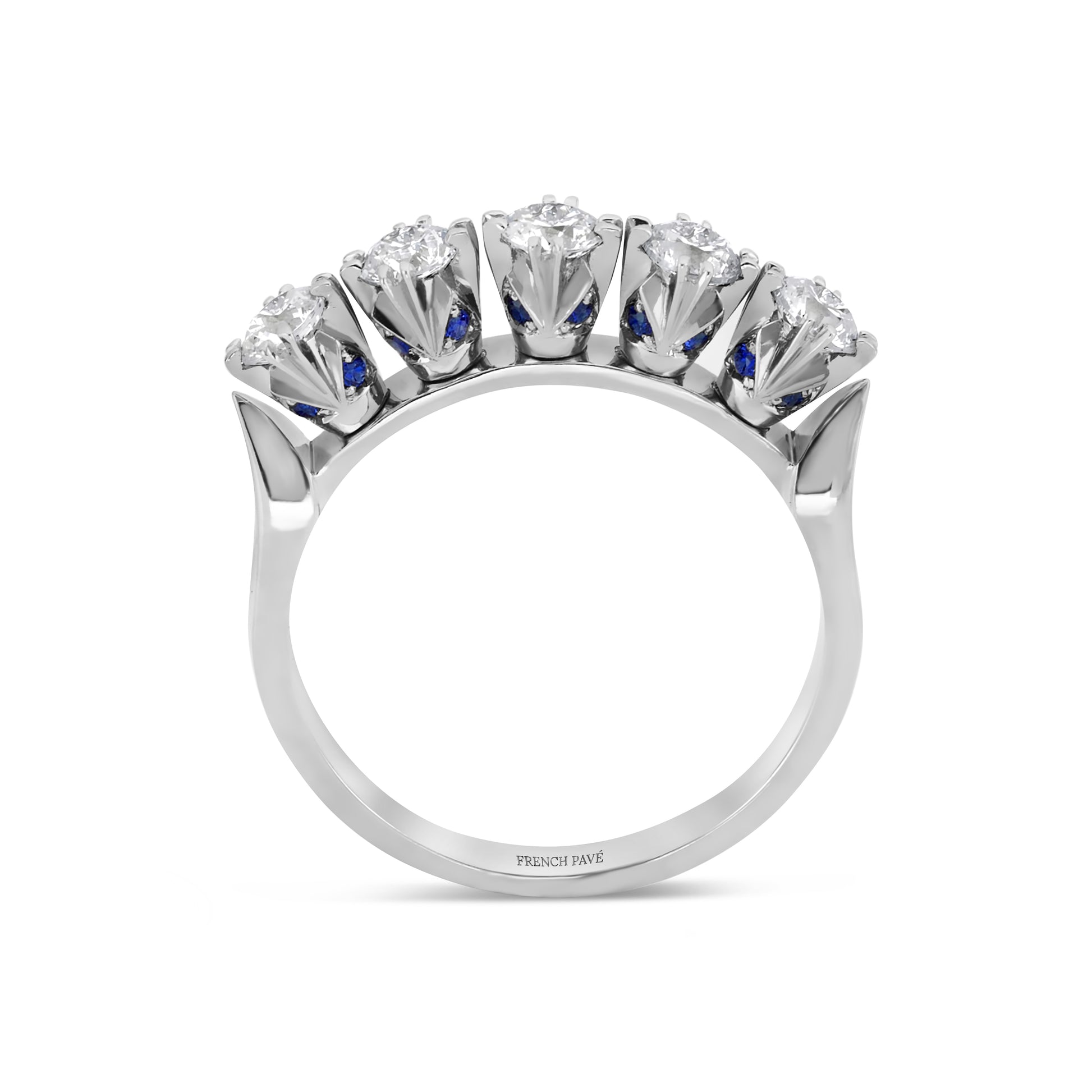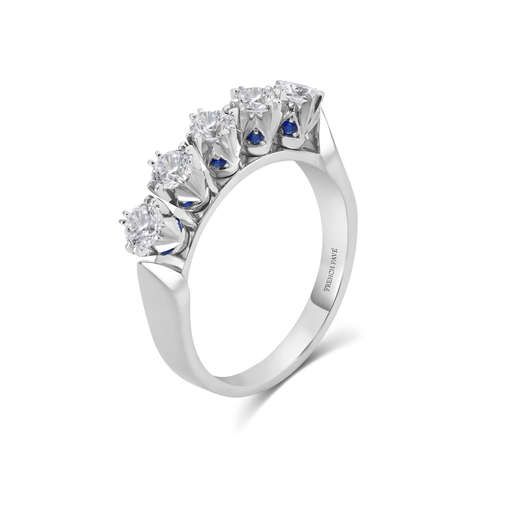 A regal diamond band inspired by timeless elegance. Crafted in solid 18K white gold and adorned with sparkling lab-grown diamonds, this design features a crown-like setting that radiates brilliance from every angle. The added sapphires create a unique contrast of color and light. Perfect as a wedding band, anniversary gift, or statement piece.