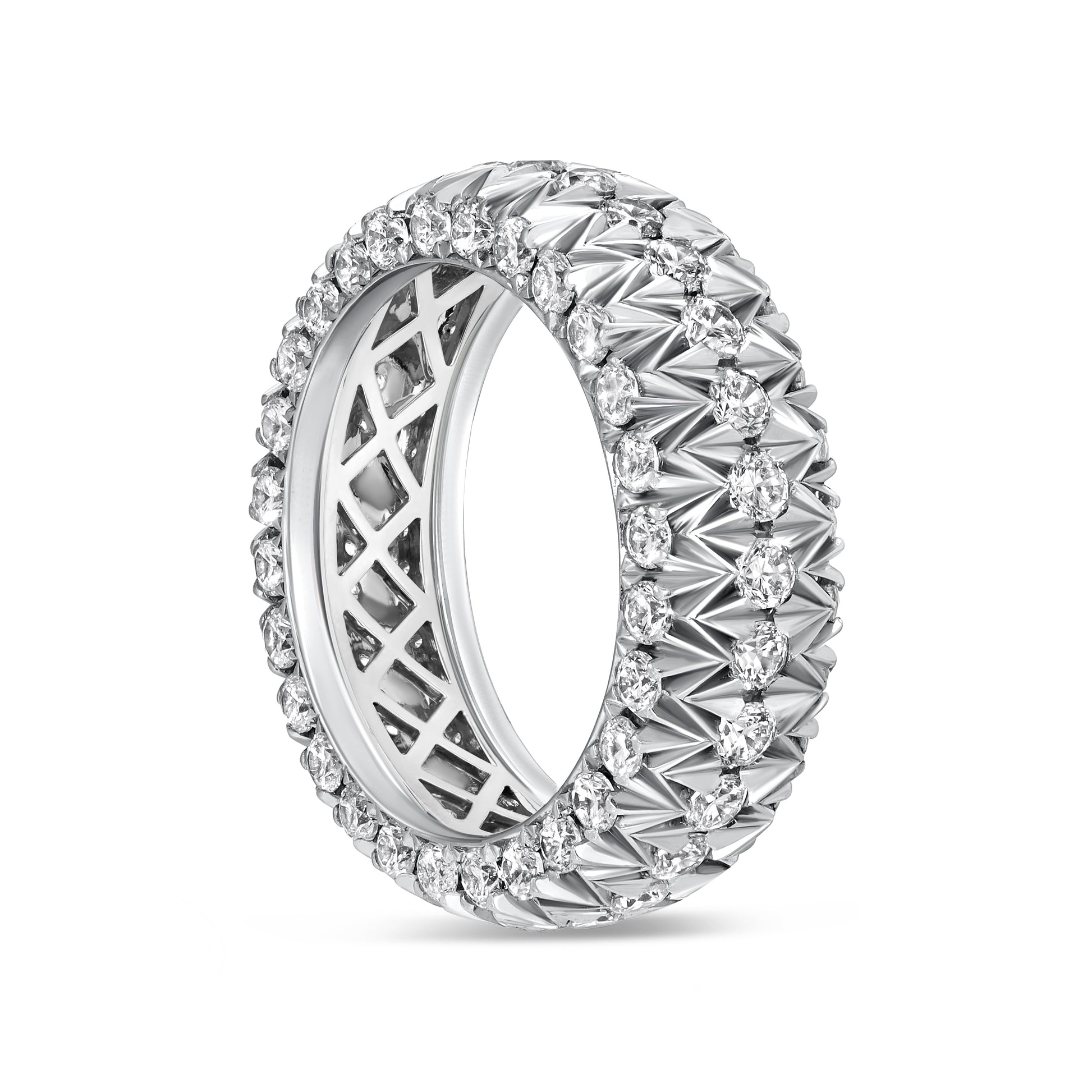 A bold eternity band that celebrates timeless elegance with a modern edge. Crafted in solid 18K white gold, this design features two rows of lab-grown diamonds, meticulously set in a geometric full-circle pattern. The arrangement of 28 larger stones and 56 smaller stones creates an eye-catching interplay of brilliance, symbolizing strength, eternity, and refined sophistication. Perfect as a wedding band, anniversary gift, or statement piece that radiates luxury from every angle.